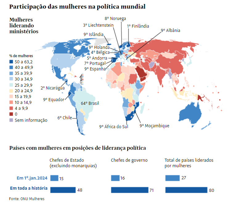 O relatório “Women Political Leaders 2024”, de janeiro, analisou a presença feminina entre líderes de Estado (excluindo monarquias), líderes de governo, além de ministérios e secretarias equivalentes em 190 países. Faltaram informações sobre Afeganistão, Coreia do Norte e Mianmar.
