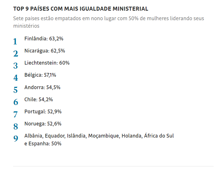 Há equidade ministerial (50% mulheres e 50% homens) em sete países. E maioria de ministras em oito. Líderes do ranking de igualdade, a Finlândia, Nicarágua e Liechtenstein têm 60% ou mais ministras mulheres.