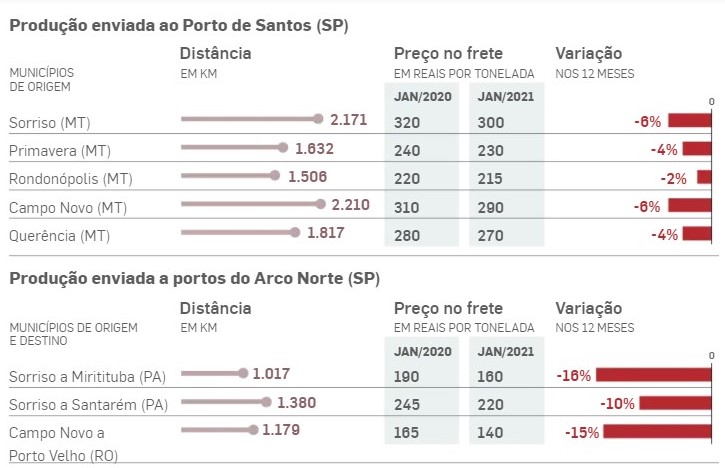 Com mais alternativas de escoamento, o preço do frete caiu de forma geral. Em janeiro de 2020, uma tonelada de grãos que saía de Campo Novo (MT) para viajar 2.210 km até o porto de Santos custava R$ 310. Um ano depois, essa mesma tonelada custa R$ 290. O mesmo comportamento de queda é visto em relação aos principais polos de produção do Mato Grosso, como Primavera, Rondonópolis e Querência.