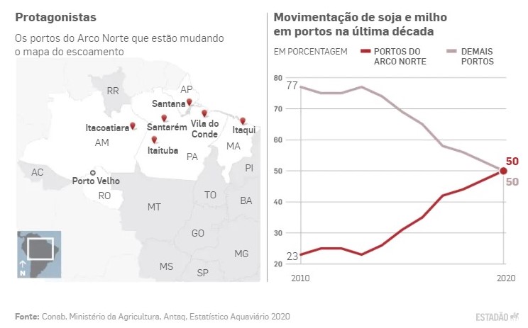 BRASÍLIA – Todos os olhos se voltam para o Norte. Pela primeira vez, os portos do chamado “Arco Norte”, localizados na região amazônica, desbancaram a preferência dos gigantes do Sudeste e Sul do País e se igualaram como destino dos grãos, com 50% cada, se considerada a movimentação portuária verificada em 2020 pelo agronegócio. A expectativa é que, neste ano, a movimentação nesses portos ultrapasse a do restante do País, já que a média de avanço anual tem sido de 4%.