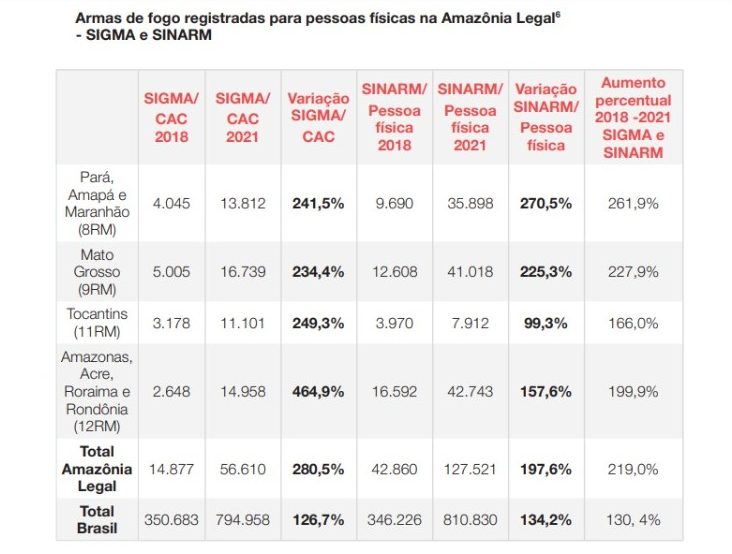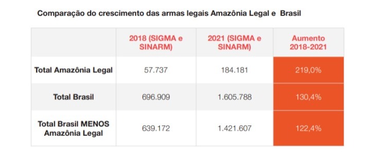 De acordo com o relatório, o aumento de 219% aconteceu entre os anos de 2018, quando a Amazônia Legal possuía 57.737 armas registradas e, 2021, quando o número saltou para 184.181. Enquanto que, no geral do Brasil, tirando a Amazônia Legal, esse número aumentou 122%.