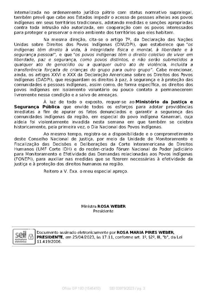 Ao final, a ministra Rosa Weber faz um pedido ao ministro Flávio Dino: “À luz de todo o exposto, requer-se ao Ministério da Justiça e Segurança Pública que envie todos os esforços para adotar providências imediatas a fim de apurar os fatos denunciados e garantir a segurança das comunidades indígenas da região, em especial, do povo indígena Kanamary, cuja aldeia foi, violentamente, invadida, nesta semana em que também se celebra, historicamente, pela primeira vez, o Dia Nacional dos Povos Indígenas”, finalizou.