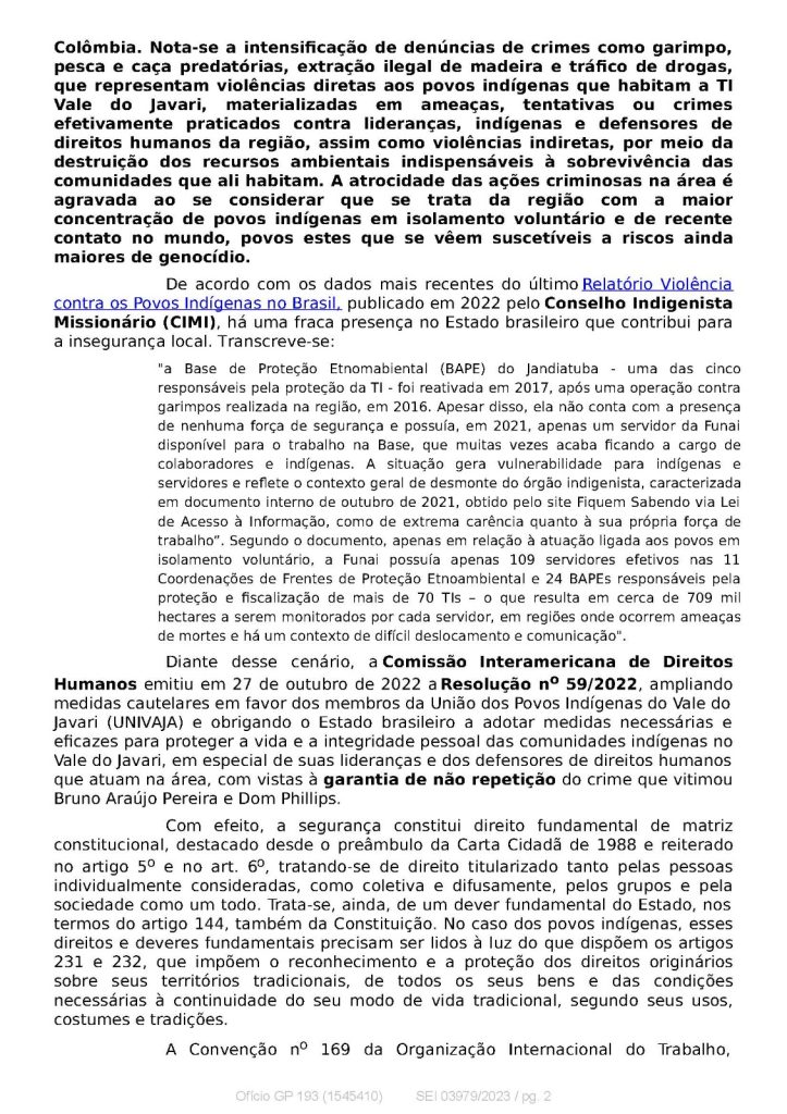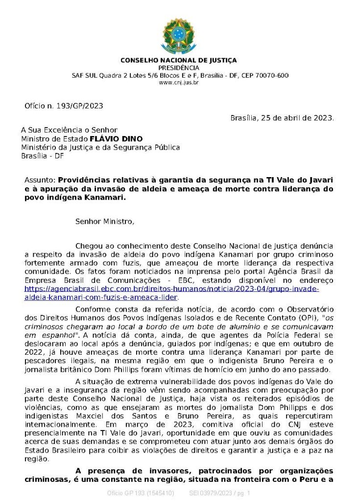 a respeito da invasão de aldeia do povo indígena Kanamary, por grupo criminoso fortemente armado com fuzis que ameaçou de morte liderança da respectiva comunidade, conforme consta da referida notícia, de acordo com o Observatório dos Direitos Humanos dos Povos Indígenas Isolados e de Recente Contato (OPI)”, diz o início do documento. “Os criminosos chegaram ao local a bordo de um bote de alumínio e se comunicavam em espanhol”.