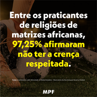 “Dados sobre a intolerância religiosa também ilustram a dimensão do problema. O expressivo percentual de 97% das pessoas que praticam religião de matriz africana diz não ser respeitado em sua crença no meio do futebol, dominado por cristãos católicos (52,8%) e evangélicos (30,91%). “A única vez que falei da minha religião, o pessoal ficou dizendo que eu tinha pacto com o diabo e me mandou calar a boca”, relatou um participante.
