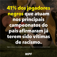 BRASÍLIA (DF) – Como resultado de um compromisso firmado pelo Ministério Público Federal (MPF) com a empresa Fisia Comércio de Produtos Esportivos Ltda., detentora dos direitos para comercialização dos produtos da marca Nike no Brasil, foi publicado o Levantamento sobre a Diversidade no Futebol Brasileiro, com ênfase em religião, gênero, raça e origem. O relatório apontou que mais de 40% dos jogadores negros afirmaram já terem sido vítima de racismo nos ambientes desportivos. A discriminação em razão da religião também foi um dos pontos identificados.