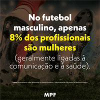 “A defasagem da participação feminina no esporte foi outro ponto de destaque na análise dos dados coletados. Segundo a pesquisa, o futebol masculino conta com apenas 8% de profissionais mulheres, enquanto 45% das pessoas que trabalham com o futebol feminino são homens. Às mulheres, no futebol masculino, restam cargos ligados à comunicação e saúde, o que mostra que, enquanto homens conseguem transitar entre competições masculinas e femininas, o mesmo não ocorre com as mulheres na mesma proporção. “O recorte deixa nítido a urgência de um trabalho que qualifique e incentive a abertura de espaço para mulheres em cargos de liderança, sejam esses em competições masculinas ou femininas”, diz trecho do estudo.