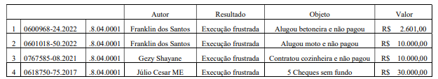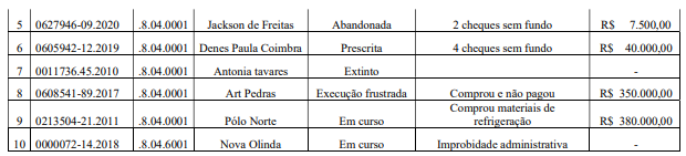 Marcelo também expõe que a empresa possui processos referentes a aluguéis, compras, cheques sem fundo e contratação de serviços de trabalhadores que não teriam sido pagos. Ao todo, a representação lista dez processos contra a empresa da pré-candidata do Psol, entre execuções frustradas, abandonadas, prescritas, extintas e em curso.