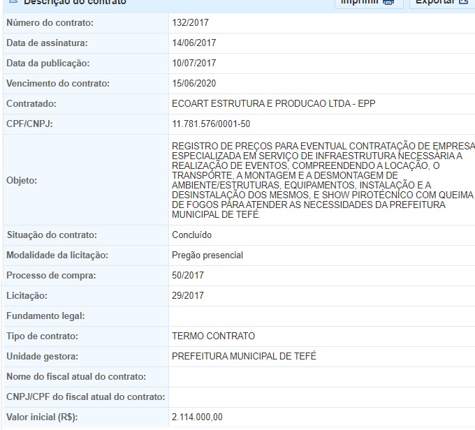 Segundo publicação na edição dessa quinta-feira, 18, no Diário Oficial dos Municípios (DOM), assinada pelo gestor, que não estipulou nem o valor da renovação, nem o valor do contrato original, a empresa ficará responsável pelos serviços de infra-estrutura necessária na realização de eventos, além da realização de show pirotécnico com queima de fogos, para atender as necessidades das secretarias municipais da prefeitura.
