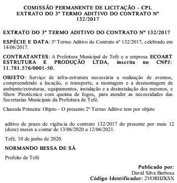 MANAUS – O prefeito Normando Bessa (PMN), pré-candidato à reeleição em Tefé (a 522 quilômetros de Manaus), renovou o contrato milionário firmado em 2017, com a empresa Acoart Estrutura e Produção Ltda., no valor de R$ 2,1 milhões, por mais 12 meses, para realização de eventos e queimas de fogos de artifício.