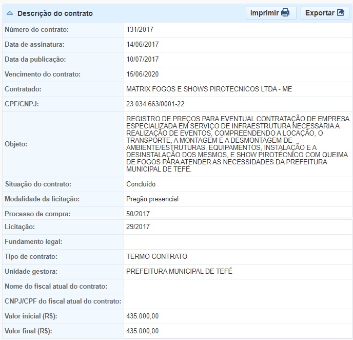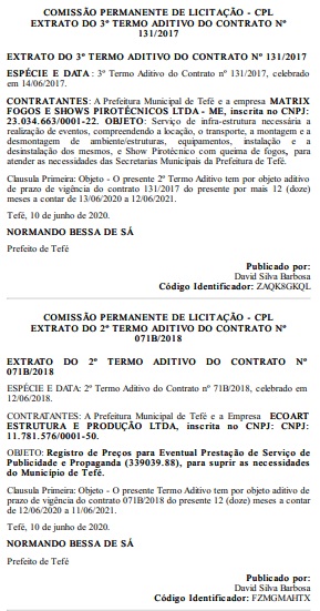 Na mesma publicação do DOM dessa quinta-feira, o contrato com a empresa Matrix Fogos e Shows Pirotécnicos Ltda – ME, também celebrado em 14 de junho de 2017, foi renovado pelo prefeito Normando Bessa por mais 12 meses.