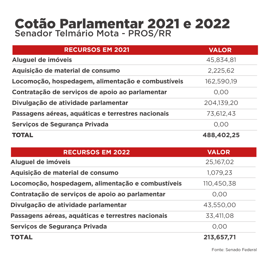 O senador Telmário Mota, ao longo de 2021, gastou R$488.402,25 do Cotão, os maiores gastos do parlamentar foram com locomoção, hospedagem, alimentação, combustíveis e gastos com publicidade, que somados ultrapassaram R$204 mil.