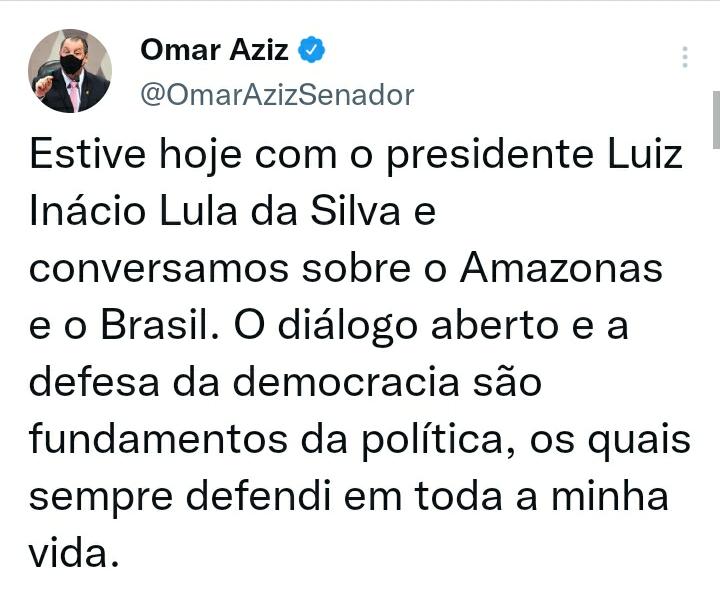 “Hoje eu encontrei o presidente Luiz Inácio Lula da Silva e conversamos sobre o Amazonas e o Brasil. O diálogo aberto e a defesa da democracia são fundamentos da política pelos quais sempre defendi em toda a minha vida. Falamos sobre o cenário nacional atual, sobre o que foi feito quando ele era presidente e também quando fui governador”, destacou Aziz.