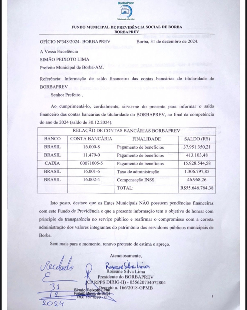 A assessoria jurídica informou ainda que, por meio de um extrato, constam as informações de valores e agências bancárias nas quais o BorbaPrev possui saldo.