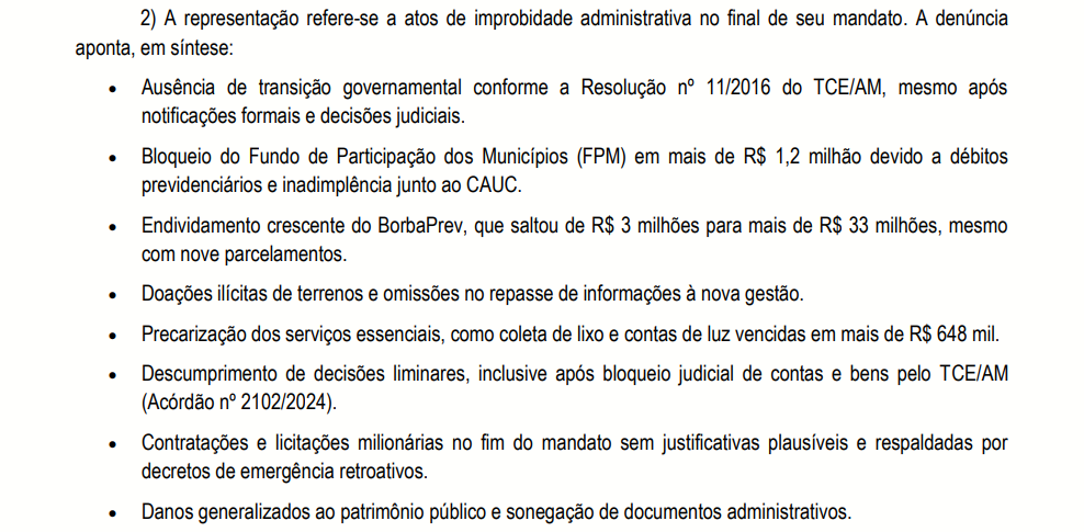 Segundo o DOE, os atos de improbidade administrativa são referentes ao final do mandato do ex-prefeito Simão Peixoto. A denúncia afirma que houve um bloqueio do Fundo de Participação dos Municípios (FPM) em mais de R$ 1,2 milhão devido a débitos previdenciários e inadimplência junto ao Cadastro Único de Convênios (Cauc). Um endividamento crescente do BorbaPrev também é citado no documento. De acordo com a representação, a previdência social saltou de R$ 3 milhões para mais de R$ 33 milhões.