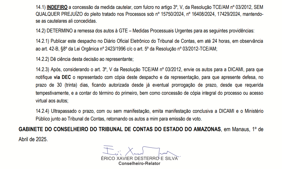 Apesar dos termos citados, o conselheiro-relator Érico Xavier Desterro indeferiu a concessão de medida cautelar, afirmando que o ex-prefeito Simão Peixoto não está mais à frente da Prefeitura de Borba nem da administração dos recursos públicos.