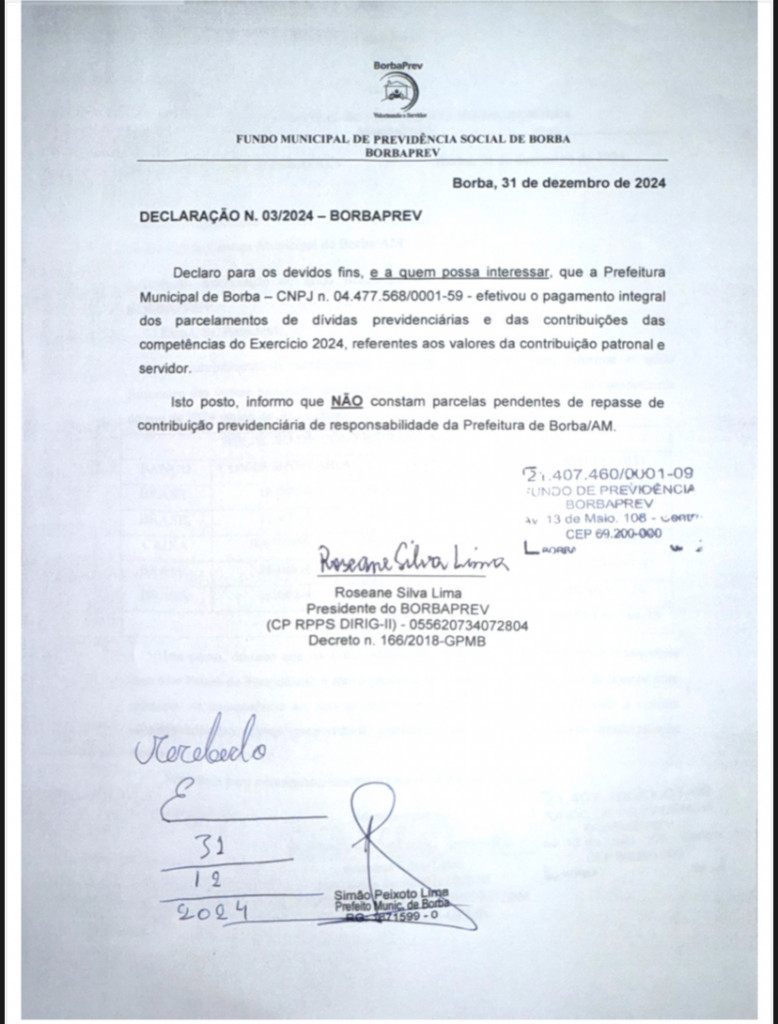 A CENARIUM entrou em contato com o ex-prefeito de Borba, Simão Peixoto, e, por meio da assessoria jurídica, a reportagem foi informada de que não há dívidas previdenciárias.