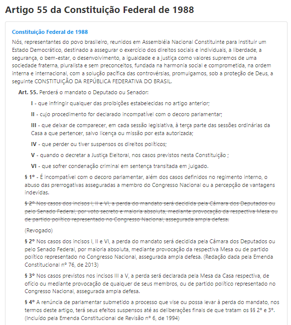 O artigo 55 da Constituição Federal de 1988 dá exemplos de condutas inadequadas que podem levar senadores e deputados, por exemplo, a perderem seus mandatos: deixar de comparecer, em cada sessão legislativa; perder ou ter suspensos direitos políticos; sofrer condenação criminal em sentença transitada em julgado e outros. Mas cada instituição tem regimento próprio, além dessas, muitas outras situações são passíveis de punição por quebra de decoro.