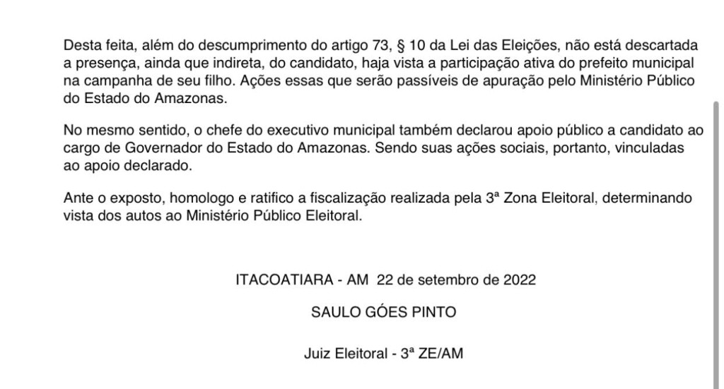 O filho do prefeito, o advogado Thiago Abrahim (União), é postulante a uma vaga na Assembleia Legislativa do Amazonas (Aleam). A constatação do juiz está no processo de “Notícia de Irregularidade em Propaganda Eleitoral 0600047-27.2022.6.04.003” assinada no dia 22 de setembro e encaminhada ao Ministério Público Eleitoral (MPE). A entrega dos brindes foi interrompida pelos fiscais da Justiça Eleitoral. Procurado, o prefeito não respondeu à reportagem.