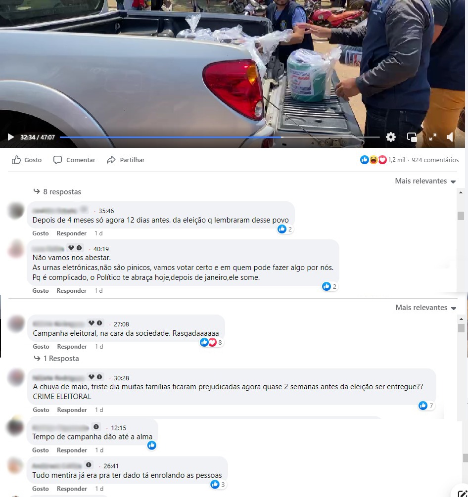 Nas redes sociais, algumas pessoas questionaram o porquê das entregas terem sido feitas somente neste período eleitoral. “Depois de 4 meses, só agora, 12 dias antes das eleições que lembraram desse povo”, comentou uma mulher na publicação.