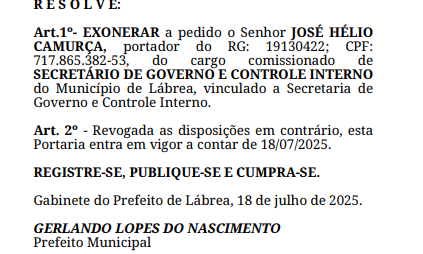 A medida foi publicada no Diário Oficial Eletrônico dos Municípios do Estado do Amazonas nesta segunda-feira, 21. “Revogadas as disposições em contrário, esta Portaria entra em vigor a contar de 18/07/2025″, diz um trecho do documento. De acordo com a Portaria 0363/2025, assinada por Lopes, o próprio Camurça foi quem pediu a exoneração da função por meio de um requerimento encaminhado ao gabinete do prefeito. Veja trecho: