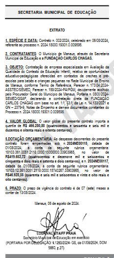 De acordo com o extrato de contrato publicado na edição do Diário Oficial do Município (DOM) da última sexta-feira, 13, a Semed informou que o serviço é para “contratação de empresa especializada em Avaliação da Qualidade do Contexto da Educação Infantil, relativo às oportunidades educativo-pedagógicas oferecidas em contextos de creches e pré-escolas para bebês e crianças pequenas na Rede Municipal de Ensino de Manaus”.