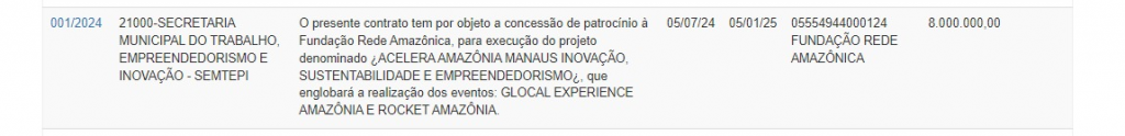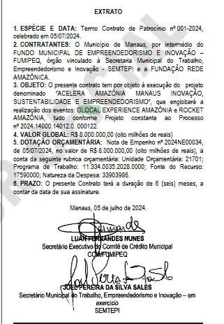 De acordo com o Extrato de Patrocínio publicado no Diário Oficial do Município (DOM) do dia 10 de julho deste ano e assinado pelo secretário Municipal em Exercício do Trabalho, Empreendedorismo e Inovação (Semtepi), Joel Sales, a verba milionária de patrocínio é para execução do projeto denominado “Acelera Amazônia Manaus Inovação, Sustentabilidade e Empreendedorismo”, que engloba a realização dos eventos Glocal Experience Amazônia e Rocket Amazônia. Veja o documento: