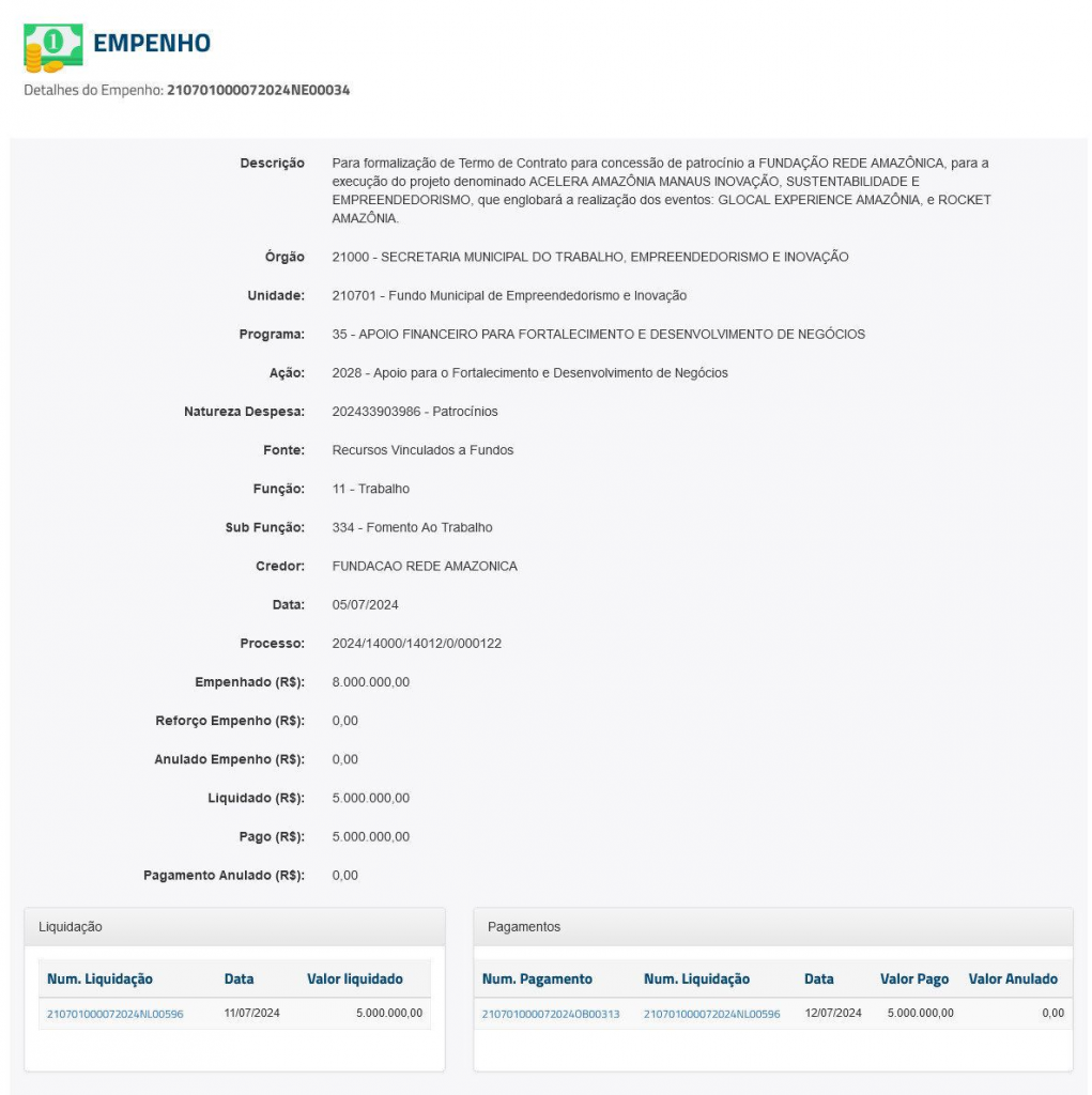 Em consulta ao Portal de Transparência da Prefeitura de Manaus, é possível constatar que a gestão de David já pagou R$ 5 milhões dos R$ 8 milhões empenhados (reserva de recurso) pelo patrocínio dos projetos. O valor foi pago no dia 12 de julho de 2024, cinco dias depois da assinatura do termo de patrocínio. Veja o documento: