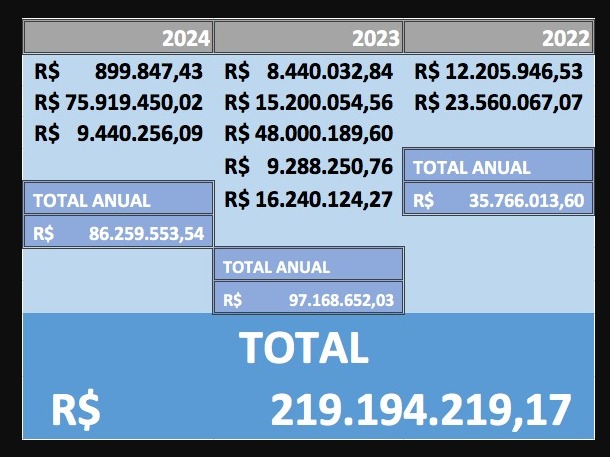 Em 2023, os repasses foram de R$ 97,1 milhões, sendo que ao menos R$ 9,2 milhões também foram pagos via processo indenizatório e o restante R$ 87,9 milhões, pagos por meio de contratos feitos sem licitação sob justificativa de questão emergencial. Já nos primeiros meses de 2024 os valores pagos ultrapassaram R$ 86,2 milhões, sendo que R$ 10,3 milhões foram pagos via contratos sem licitação.
