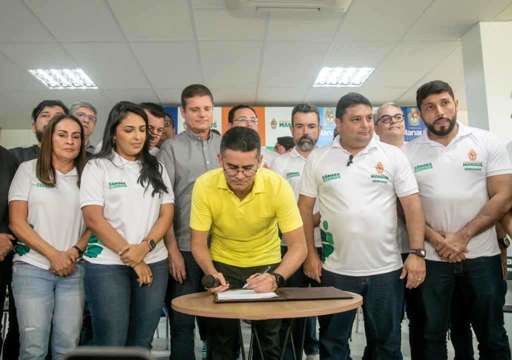 MANAUS – O prefeito de Manaus, David Almeida, sancionou, nesta sexta-feira, 31, a Lei nº 3.024/2023, oriunda da Câmara Municipal de Manaus (CMM), que proíbe a instalação dos medidores aéreos de energia na cidade de Manaus. A assinatura do documento aconteceu no Centro de Cooperação da Cidade (CCC), no bairro Adrianópolis, Zona Centro-Sul, com a presença do presidente da CMM, Caio André, e vereadores favoráveis à criação da legislação.