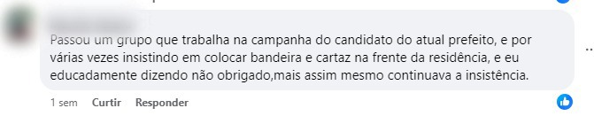 Outro internauta comenta: “passou um grupo que trabalha na campanha do candidato do atual prefeito, e por várias vezes insistindo em colocar bandeira e cartaz na frente da residência, e eu educadamente dizendo não obrigado, mas assim mesmo continuava a insistência” declarou.