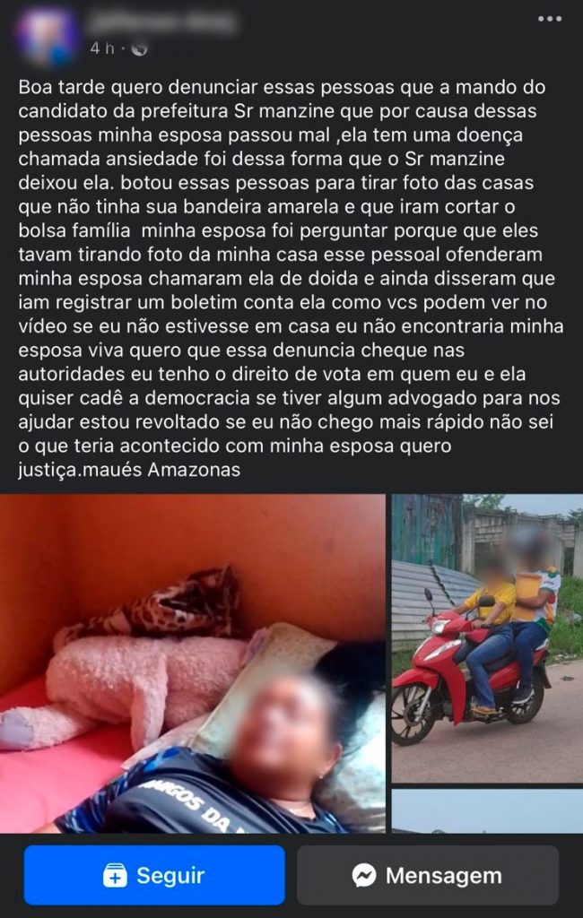 Em um post nas redes sociais, um morador de Maués denunciou o assédio eleitoral. Ele afirmou que a sua esposa tem ansiedade e chegou a passar mal ao saber que assessores da prefeitura estavam fazendo registros das casas que não estavam com bandeiras da cor do candidato apoiado por Junior Leite (União Brasil).