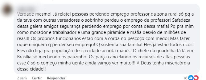 Outra publicação indica demissão por viés político. De acordo com o internauta, o grupo político que ocupa espaços na administração municipal no município são “uma grande pirâmide de máfia que desvia milhões de reais”.