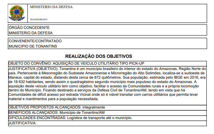 O documento, que traz a justificativa para a destinação do veículo à cidade, diz ainda que o utilitário ficaria a serviço da Defesa Civil de Tonantins. Um registro realizado por um morador mostra que servidores do órgão realizam o trabalho diário em uma carroça improvisada.