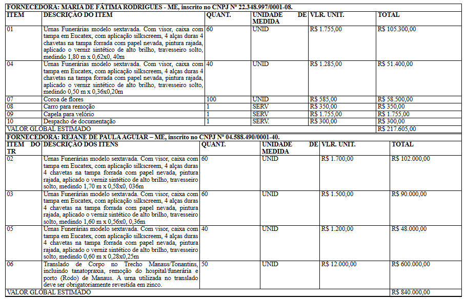 De acordo com o despacho de homologação do contrato, publicado no Diário Oficial dos Municípios do Estado do Amazonas (DOM-AM) na segunda-feira, 10, sob o número do processo 68/2023, a negociação prevê o fornecimento de 260 urnas funerárias que variam de R$ de 1.200 a R$ 1.755. Além do translado de 50 corpos do trecho Manaus-Tonantins, com valor de R$ 12 mil cada.