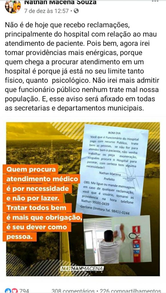 “Não é de hoje que recebo reclamações, principalmente, do hospital com relação ao mau atendimento de paciente. Pois bem, agora irei tomar providências mais enérgicas, porque quem chega a procurar atendimento em um hospital é porque já está no seu limite tanto físico, quanto psicológico. Não irei mais admitir que funcionário público nenhum trate mal nossa população. E, esse aviso será afixado em todas as secretarias e departamentos municipais”, escreveu o prefeito, em uma publicação no Facebook.