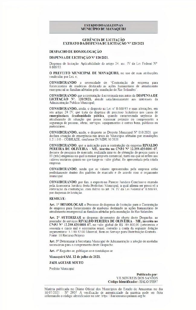 De acordo com o Diário Eletrônico dos Municípios do Amazonas, consultado nesta quarta-feira, 28, a empresa ganhadora da licitação Nº 120/2021 foi a Rivaldo Pereira de Oliveira, CNPJ 12.259.425/0001-07, que deverá receber o total de R$ 765.800 pelos serviços madereiros. Segundo o documento, a empresa fornecerá “madeiras destinadas a ações humanitárias de atendimento emergencial as famílias afetadas pela inundação do rio Solimões”.