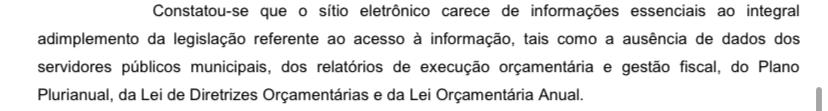 Ao determinar a atualização do Portal da Transparência de Itacoatiara, o conselheiro Josué Cláudio constatou que o site carece de informações essenciais sobre o que manda a legislação atual, referente ao acesso à informação. Foram constatadas a ausência de dados dos servidores públicos municipais, dos relatórios de execução orçamentária e gestão fiscal, do Plano Plurianual, da Lei de Diretrizes Orçamentárias (LDO) e da Lei Orçamentária Anual (LOA).