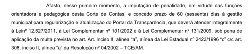 “Nesse primeiro momento, a imputação de penalidade, em virtude das funções orientadora e pedagógica desta Corte de Contas, e concedo prazo de 60 (sessenta) dias à gestão municipal para regularização e atualização do Portal da Transparência, que deverá atender integralmente à Lei nº 12.527/2011, à Lei Complementar nº 101/2002 e à Lei Complementar nº 131/2009, sob pena de aplicação da multa prevista no art. Art. inciso II, alínea “a”, alínea da Lei Estadual nº 2423/1996 “c” c/c art. 308, inciso II, alínea “a” da Resolução nº 04/2002 – TCE/AM”, destacou o conselheiro.