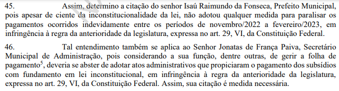 A Corte de Contas identificou que o prefeito e o Secretário de Administração eram os únicos com autoridade para suspender os pagamentos inconstitucionais, mas não o fizeram, caracterizando má-fé a partir de novembro de 2022. Dessa forma, foi ordenada a devolução dos valores recebidos indevidamente entre novembro de 2022 e fevereiro de 2023, totalizando R$ 274.896,39.