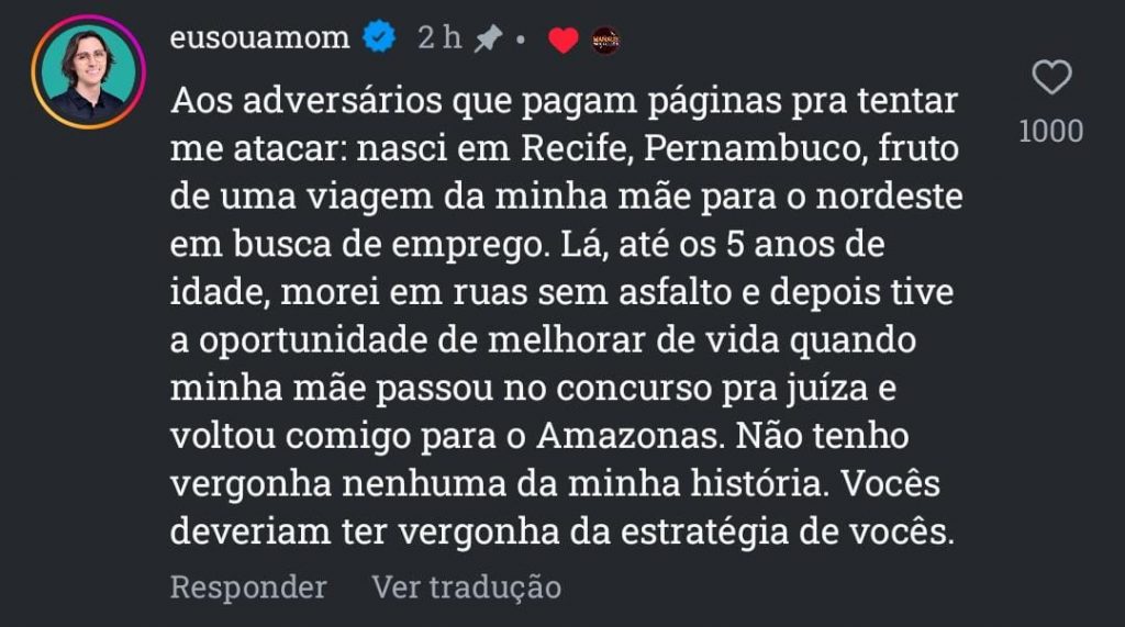 “Pensei que era um debate, não um programa humorístico“, disse uma pessoa. “É verdade, ele era meu vizinho aqui no Monte Sião“, declarou outra, fazendo referência à comunidade do bairro Jorge Teixeira, na Zona Leste da capital amazonense.