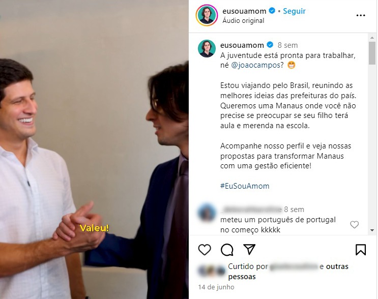 Em vídeo publicado nas redes sociais, Amom Mandel questiona João Campos, que foi eleito aos 27 anos, sobre as críticas recebidas pelo prefeito por ainda ser jovem. “O que tu falas quando falam que tu és muito jovem?“, diz o pré-candidato manauense. “Rapaz, a juventude está pronta para trabalhar, para fazer“, responde João Campos na gravação. “Nós queremos copiar o que tem que melhor no Brasil“, acrescenta Mandel.