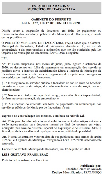 MANAUS – O prefeito interino de Itacoatiara (a 270 quilômetros de Manaus), Luís Gustavo Braz (Cidadania), sancionou a Lei Nº 427, de 1º de junho de 2020, que suspende, nos meses de junho a setembro, os descontos em folha dos valores referentes ao pagamento de empréstimos consignados concedidos por instituições financeiras aos servidores públicos da cidade.