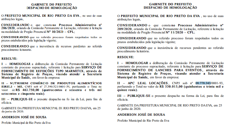 Para os serviços, duas empresas foram contratadas: uma ao valor de R$ 463 mil, a manauara Nutribeni Comércio de Produtos Alimentícios – ME, responsável por fornecer as marmitas, e, outra ao valor de R$ 530 mil, a empresa APC Leal Locações, localizada em Rio Preto da Eva, que disponibilizará os lanches para eventos.