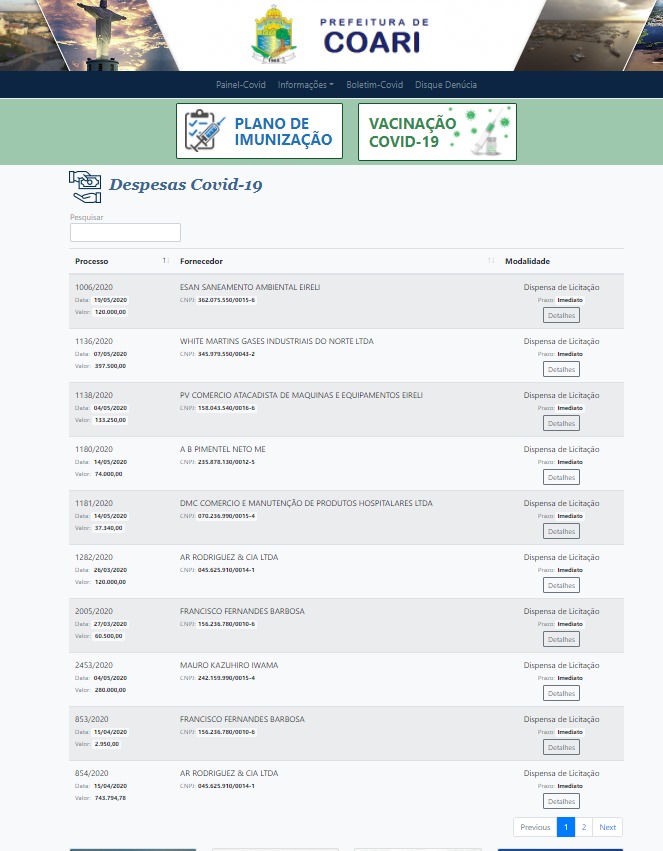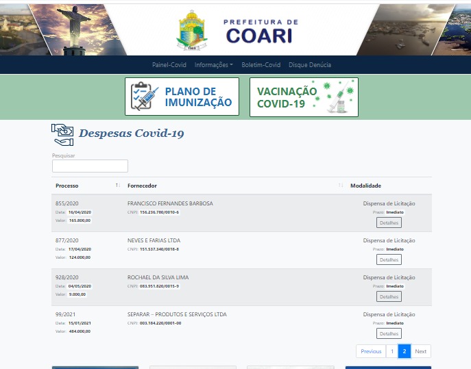 O portal mostra, ainda, que quase R$ 403 mil foram destinados à aquisição de testes para Covid-19, a partir da contratação de três empresas, todas beneficiadas com dispensa de licitação.
