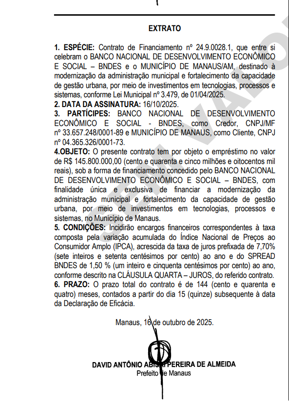 MANAUS (AM) – Após o pedido ter sido aprovado pela Câmara Municipal de Manaus (CMM), a gestão do prefeito David Almeida (Avante) celebrou um empréstimo de R$ 145,8 milhões com o Banco Nacional de Desenvolvimento Econômico e Social (BNDES), aumentando a dívida pública para mais de R$ 5,3 bilhões. O contrato foi publicado no Diário Oficial do Município (DOM) de quinta-feira, 23.