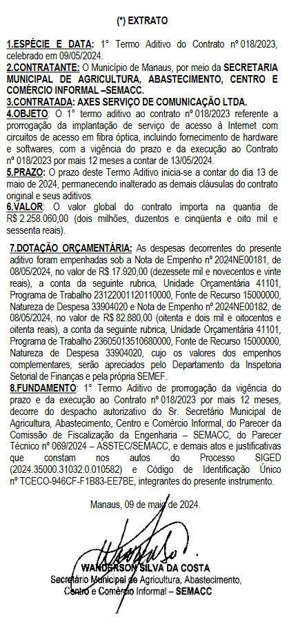 MANAUS (AM) – A Secretaria Municipal de Agricultura, Abastecimento e Comércio Informal (Semacc), sob a gestão do prefeito de Manaus, David Almeida (Avante), renovou contrato no valor de R$ R$ 2.258.060,00 com a empresa AXES SERVIÇO DE COMUNICAÇÃO LTDA. para a implantação de serviço de acesso à Internet. Recentemente, o conselheiro do Tribunal de Contas do Amazonas (TCE-AM) Júlio Pinheiro cancelou uma licitação da prefeitura em que a empresa Axes foi declarada vencedora sob suspeita de superfaturamento, o que poderia causar prejuízo ao erário em mais de R$ 10 milhões. Veja o documento: