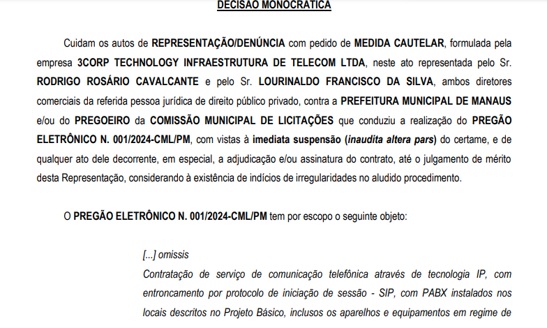 A denúncia foi formulada pela empresa 3CORP TECHNOLOGY INFRAESTRUTURA DE TELECOM LTDA., que informou ao TCE-AM que venceu o pregão apresentando o menor lance no valor de R$ 5.038.800,00. Mas, de acordo com a 3CORP, foi desclassificada após uma série de suspensões das sessões e viu uma concorrente vencer o certame por de R$ 15.248.224,00.