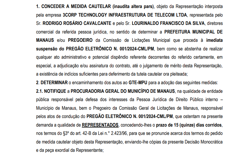 Júlio Pinheiro determinou a imediata suspensão do Pregão Nº 001/2024-CML/PM. “Bem como se abstenha de realizar qualquer ato administrativo e potencial dispêndio referente decorrentes do referido certamente, em especial, a adjudicação e/ou assinatura do contrato, até o julgamento de mérito desta Representação, a existência de indícios suficientes para deferimento da tutela cautelar ora pleiteada”, finalizou o conselheiro.