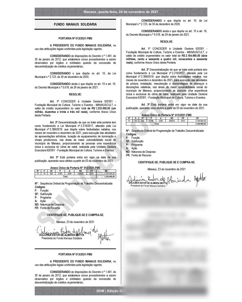As portarias nº 012 e 013/2021 do Fundo Manaus Solidário (FMS) são assinadas pela presidente da pasta, a professora Dulcinea Ester de Almeida Motta. De acordo com as publicações, o montante é concedido à Fundação Municipal de Cultura, Turismo e Eventos (ManausCult) e dispõe sobre as festividades natalinas nos meses de novembro e dezembro deste ano.