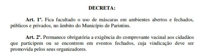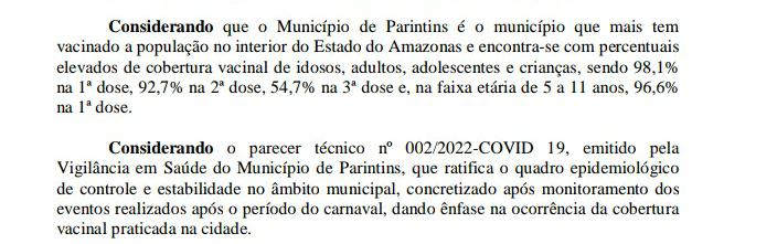 A medida considera que Parintins é o município do interior do Amazonas que mais tem vacinado a população, com percentuais elevados na cobertura vacinal de idosos, adultos, adolescentes e crianças. 98,1% da população adulta tomou a primeira dose, 92,7% tomaram a segunda dose e 54,7% estão imunizados com as três doses da vacina. Entre as crianças com idade entre 5 e 11 anos, 96,6% tomaram a primeira dose.